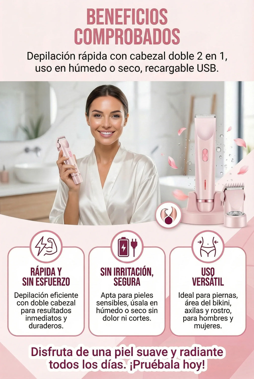 ✅ Elimina el vello de forma práctica ✅ Mantiene la piel suavey cuidada ✅ Retoca zonas delicadas sin irritación ✅ Ahorra tiempo y dineroen depilaciones ✅ Usa en casa o llévala de viaje